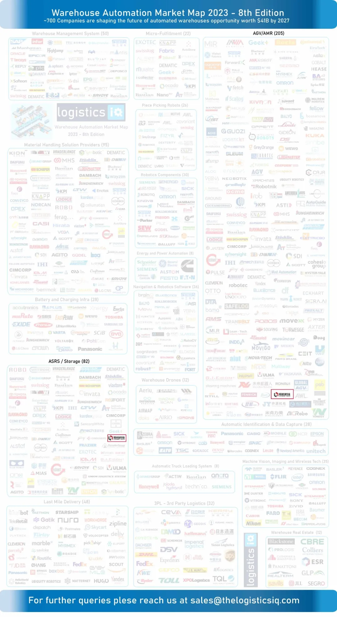 国际权威物流&供应链研究咨询公司LogisticsIQ发布最新版市场图谱:《仓储自动化市场图谱》和《AGV-AMR市场图谱》。该机构预计,2022年到2027年间,自动化仓储市场规模将达410亿美元,实现CAGR 15%;且全球AGV/AMR市场规模或超180亿美元,增速分别为24%和43%。联核科技凭借优秀的无人叉车产品及广泛的行业应用,荣登“AGV/AMR”—移动机器人、“ASRS / Storage”—自动化仓储、“Manufacturing & Logistics”—制造与物流 三大板块,在国际市场崭露头角!