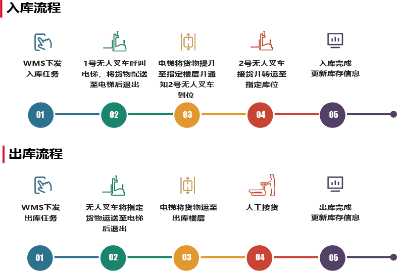无人叉车与电梯实时交互,发送指令使其提前到达指定楼层,减少停留时间。不同楼层车辆在调度系统统一管理下,协同作业,大幅提升搬运效率。