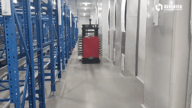由于药品储存的特殊性及生产工艺要求,无人叉车需在高低温环境交替作业及连续冷库作业,冷热温差高达近30℃;此外,现场存在较多金属墙面和玻璃面等特殊环境,给网络部署和定位导航造成一定干扰,种种工况条件导致项目实施难度加倍,联核凭借服务各行业上百位客户积累的项目实施经验、优质的产品选型和全方位的防护措施,有效避免网络强干扰,导航信号波动和丢失、关键元器件损坏等潜在问题,保证项目稳定运行。